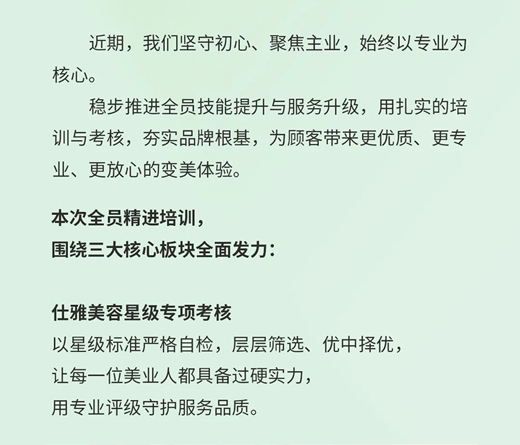 仕雅美容星级专项考核以星级标准严格自检,层层筛选、优中择优,让每一位美业人都具备过硬实力,用专业